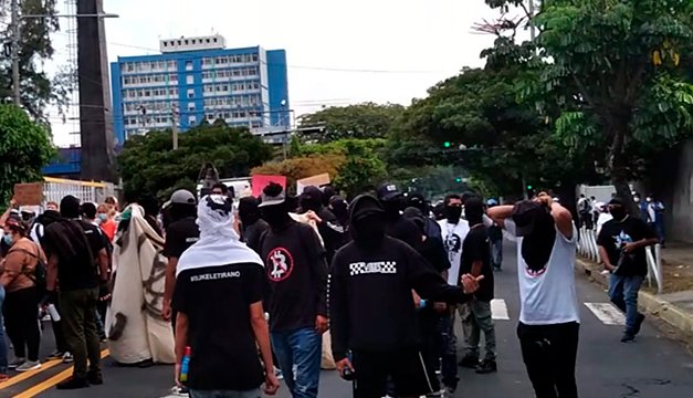 Sobre la 25 Avenida Norte, a las 9:27 a.m., entre las filas se escuchaba la frase: “¡hay un grupo de choque de infiltrados!”, en referencia a un grupo de personas, en su mayoría jóvenes, que vestían de negro.