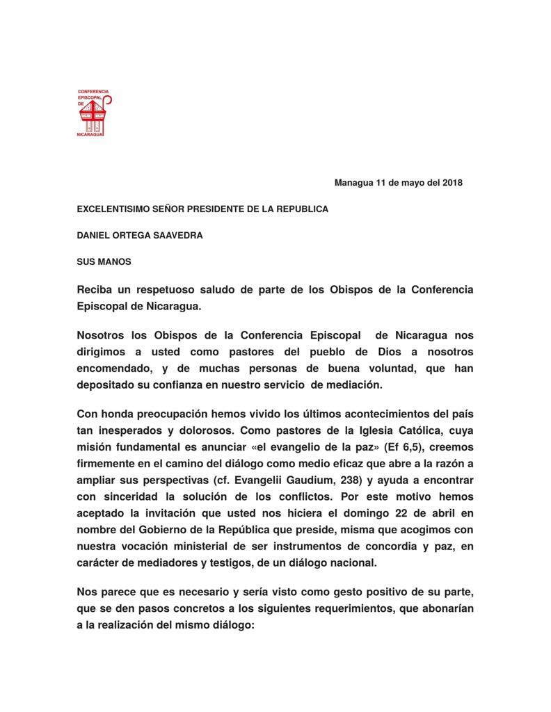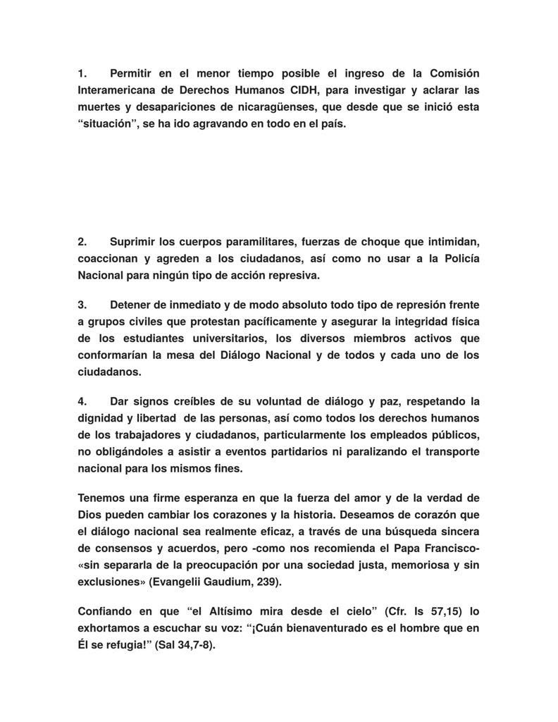 La Conferencia Episcopal de Nicaragua (CEN) exhortó a Ortega a permitir el ingreso de la Comisión Interamericana de Derechos Humanos (CIDH) de la OEA, “para investigar y aclarar las muertes y desapariciones de nicaragüenses” como un gesto positivo” antes de iniciar un diálogo. El gobierno debe responder a la jerarquía católica antes del lunes a mediodía.