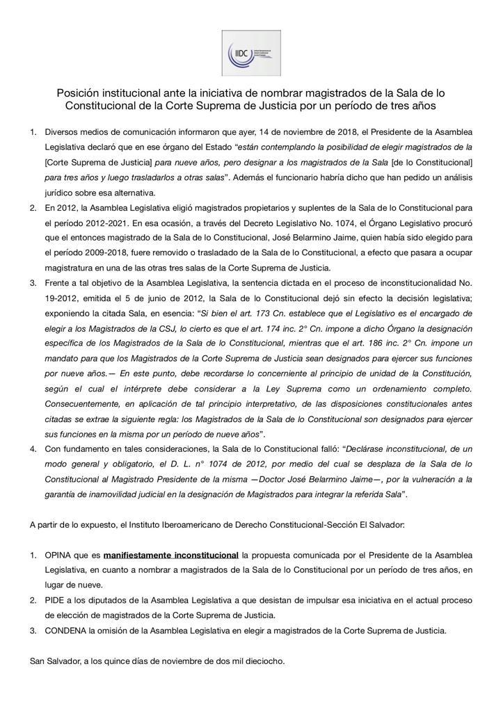 "Es manifestantemente inconstitucional la propuesta comunicada por el presidente de la Asamblea Legislativa, en cuanto a nombrar magistrados de la Sala de lo Constitucional por un período de tres años en lugar de nueve", dice un escrito emitido por el instituto esta mañana.
