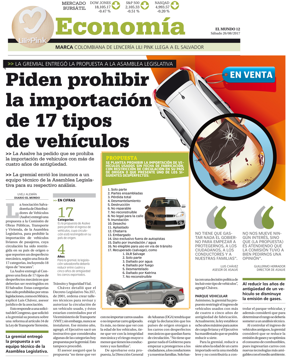 A finales de agosto, la Asociación Salvadoreña de Distribuidores de Vehículos (Asalve), entregó un documento al congreso para prohibir la importación de vehículos livianos de pasajeros, cuya circulación ha sido restringida en su país de origen o que reporten un desperfecto mecánico. Asimismo, propuso restringir el ingreso de carros usados con más de cinco años de fabricación.