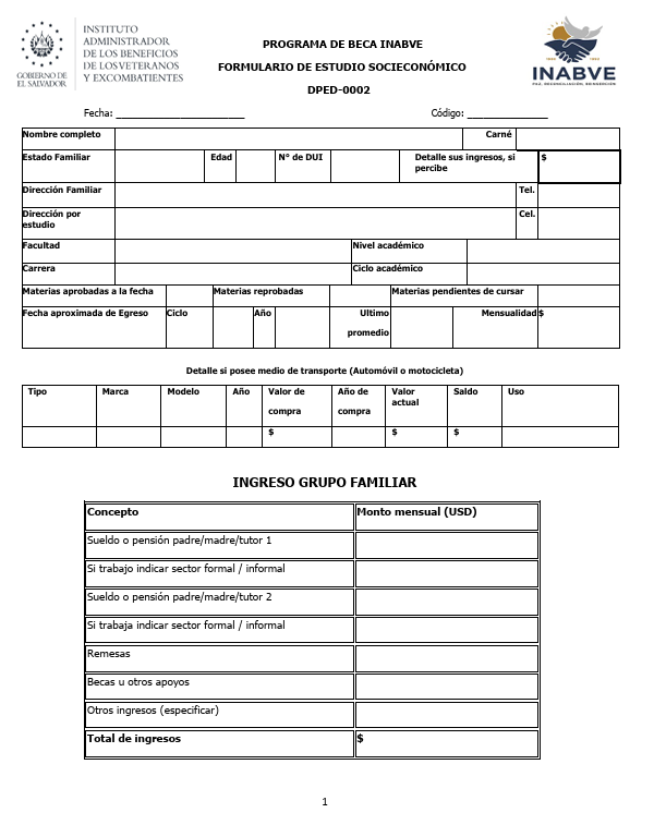 El Instituto Administrador de los Beneficios de los Veteranos y Excombatientes (Inabve) publicó el formulario para que solicitantes de becas apliquen a estudios socioeconómicos para recibir dichas prestaciones el próximo año.