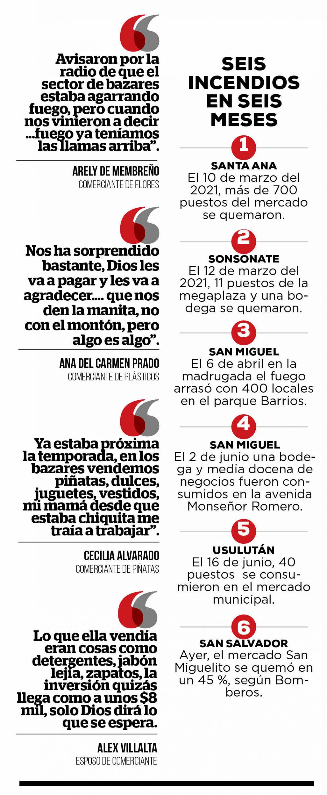 “Yo trabajo en el vivero, cuando venimos a ver ya estaba las llamaradas en la primera entrada y todas las personas empezaron a salir, y en el vivero mantenemos un cumbo de agua y lo empezamos a tirar a queriéndolo apagar, pero ya no se podía”, relató Karla Romero, quien labora en local. Tras una línea amarilla de “no pasar” se encontraba Juan Fernando Alfaro, quien buscaba a su esposa “Edelmira”, a quien había dejado en los puestos de verduras y piñatas con los que se han ganado el sustento durante los últimos 23 años.