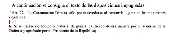 Se trata del artículo 72 de la Ley de Adquisiciones y Contrataciones de la Administración Pública (LACAP), la “contratación directa solo podrá acordarse” cuando ocurran determinadas situaciones, una de ellas es, “si se tratase de equipo o material de guerra, calificado de esa manera por el ministro de la Defensa y aprobado por el presidente de la República”.