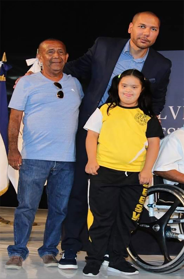 El titular del INDES; Yamil Bukele, posa con una para atleta estudiantil. / Indes
