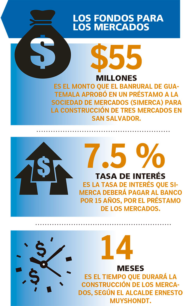 Según el jefe edilicio, el préstamo servirá para la construcción de tres mercados, uno en el parque Hula Hula, otro en el predio exbiblioteca (frente al mercado Excuartel) y uno más en el distrito tres de San Salvador. Sin embargo para construir en el predio de la exbiblioteca hace falta una permuta con el Ministerio de Educación, Ciencia y Tecnología, quien es el dueño del terreno.