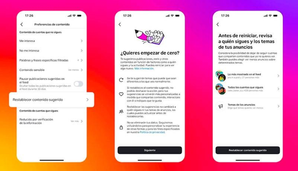 La compañía tecnológica comenzó, por tanto, a probar el restablecimiento de recomendaciones, para que "con solo unos pocos toques" los usuarios puedan borrar el contenido recomendado en apartados dedicados a ello. Esto es, Reels, Feed y Explorar.