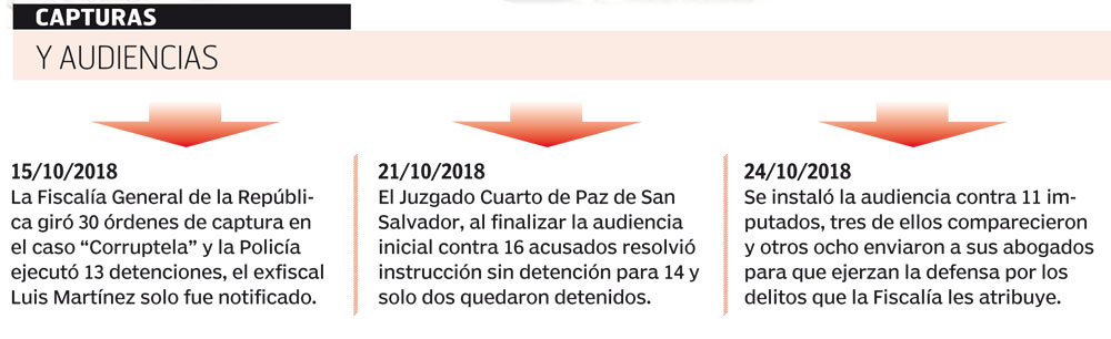 En el Juzgado Cuarto de Paz de San Salvador se instaló ayer la audiencia inicial contra 11 imputados que eran ausentes en el caso conocido como “Corruptela”, pero al ser notificados de los delitos que la Fiscalía les atribuye, tres decidieron presentarse y el resto envió a sus abogados para que los represente en la causa penal.