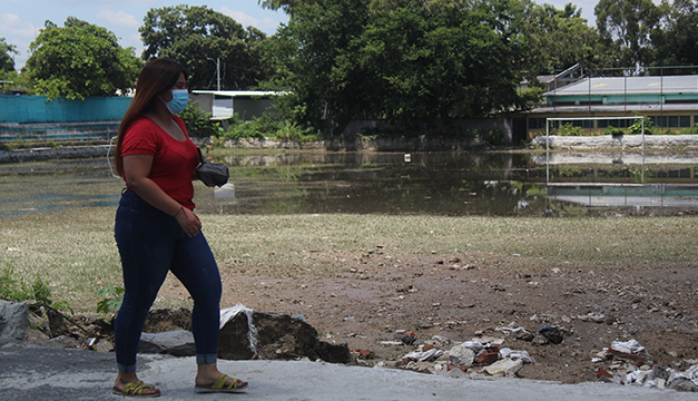 La cancha “Azteca” de la colonia Santa Lucía se inunda, desde que las autoridades botaron un muro. Ahora temen una nueva cárcava ahí. Foto DEM-Gabriel Aquino