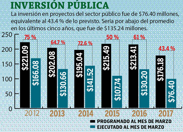 A marzo se ejecutó una inversión pública de $76.40 millones, cuando el promedio, de 2012 a 2016, fue de $135.24 millones.