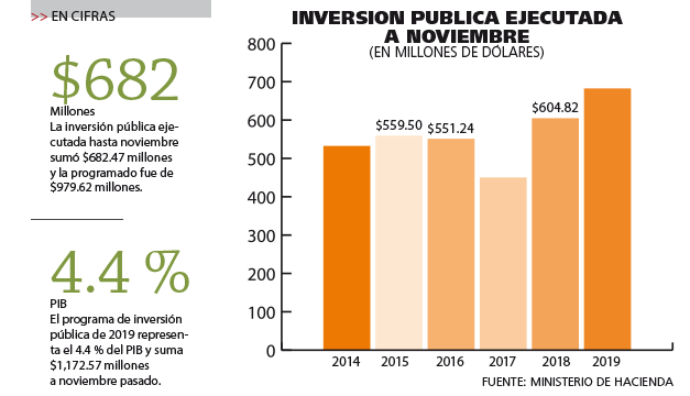 La ejecución de la inversión pública llegó a $682.47 millones a noviembre pasado, equivalente a $77.65 millones adicionales frente a 2018, un 12.8 % de crecimiento, indican las estadísticas del Ministerio de Hacienda.