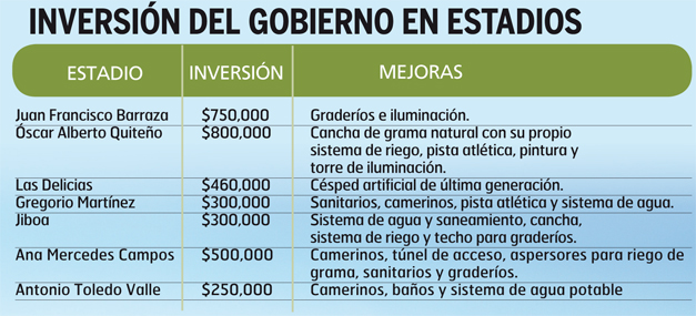 En Las Delicias se invertirán $460,000 para el cambio del césped artificial por uno de última generación, y en el “Sombrero” y el Jiboa se destinarán $300,000 en cada uno. En el primero, para remodelación de sanitarios, camerinos, pista atlética y sistema de agua, y en el segundo, para restauración de la cancha, instalación de sistema de riego y construcción de techo para graderíos.