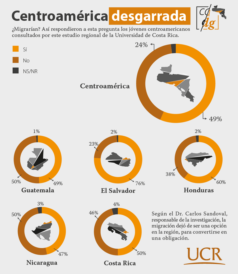 Ante este panorama, el 76% de los jóvenes salvadoreños consultados en la investigación manifestó su interés por irse a vivir a otro país; decisión a la que se suman 61% de los hondureños, 50% de los costarricenses, 49% de los guatemaltecos y 47% de los nicaraguenses.