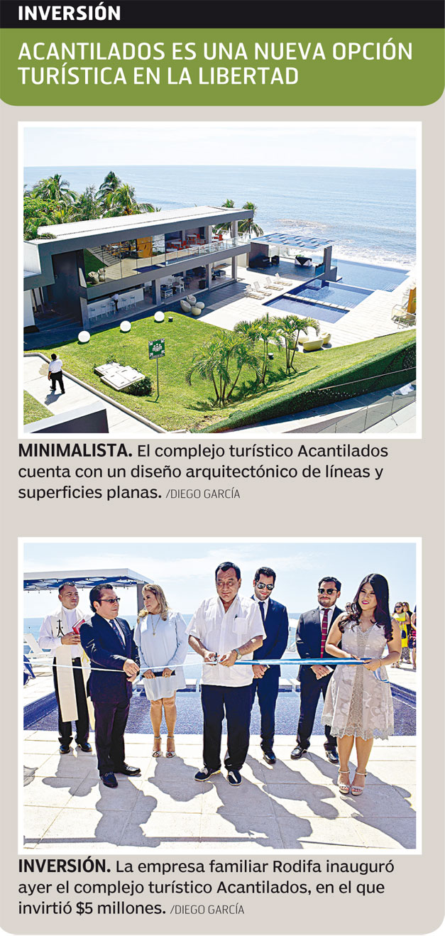 El grupo Rodifa S.A. de C.V. invirtió $5 millones en el diseño y construcción del complejo turístico Acantilados, inaugurado ayer, edificado sobre la escarpa de la costa salvadoreña, en el Puerto de La Libertad.