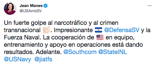 La diplomática felicitó a los efectivos salvadoreños que participaron en la operación, y aseguró que la confiscación es el resultado de “la cooperación de Estados Unidos en equipo, entrenamiento y apoyo” a las fuerza militares salvadoreñas y que dichas “operaciones está dando resultados”.