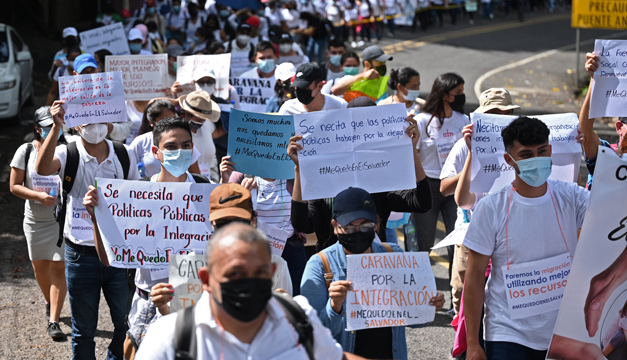 Bajo el lema "Me quedo en El Salvador", los jóvenes, de diferentes zonas del país y algunos acompañados por sus padres y abuelos, se concentraron en el paso fronterizo de Las Chinamas, 100 km al oeste de San Salvador.