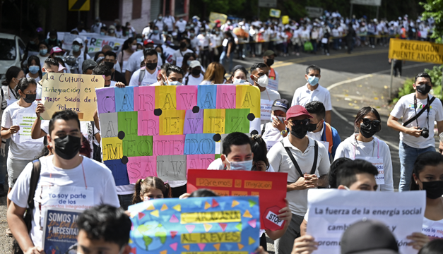 Unos 2.000 salvadoreños, en su mayoría jóvenes de comunidades pobres, marcharon este sábado desde un paso fronterizo con Guatemala para reclamar a la sociedad y al Gobierno oportunidades de desarrollo para no verse forzados e emigrar.