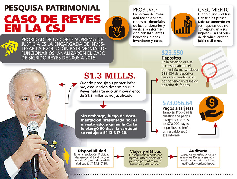 Probidad le detectó inicialmente a Reyes 47 irregularidades por $1,357,579.03, dentro de las cuales se mencionaban cuatro irregularidades por depósitos bancarios y adquisición de vehículos por un monto de $67,893.01, además de otras 40 irregularidades por depósitos y retiros, vehículos, inversiones y pagos de deudas por $1,249,186.69, de acuerdo a una fuente judicial.