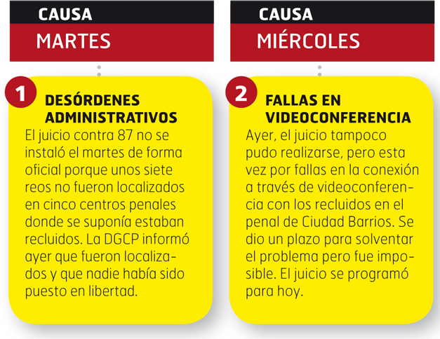 A las 2:00 p.m., la representación fiscal y los abogados defensores de los 87 imputados ya estaban listos en la sala, esperando la instalación del juicio. Cuando el juez ingresó a sala manifestó: “Seguimos en lo mismo. La Dirección General de Centros Penales no ha sido capaz de resolver el impasse”, y que “no se sabe cuánto tardarán en arreglarlo”, dijo.