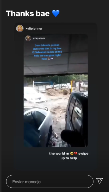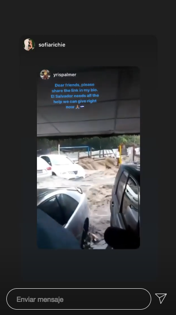 Palmer colgó en su cuenta en Instagram una foto y videos de las inundaciones y escribió: “Con todo lo que sucede en el mundo, esto es lo último que necesitamos. Necesitamos orar por todos en El Salvador que ha sido afectados por esta tormenta, 30,000 personas han perdido sus hogares”, mientras la publicación lleva a los internautas al servicio de donativos Gofundme.com