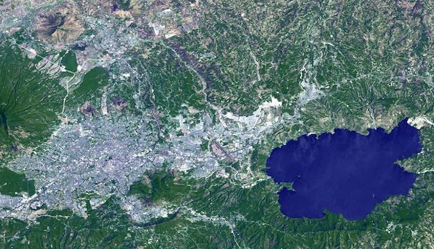Una vista satelital del Lago de Ilopango, cráter del volcán que estalló hace 1,500 años, a la par del lago, hoy se erige el área metropolitana de San Salvador.