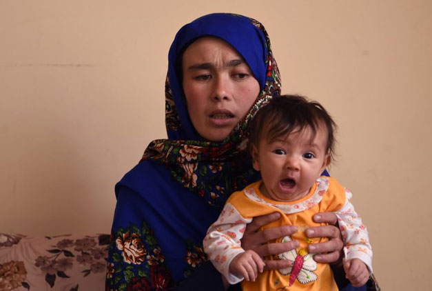 La madre afgana Jahantab Ahmadi, de 25 años, sosteniendo a su hijo menor. AFP