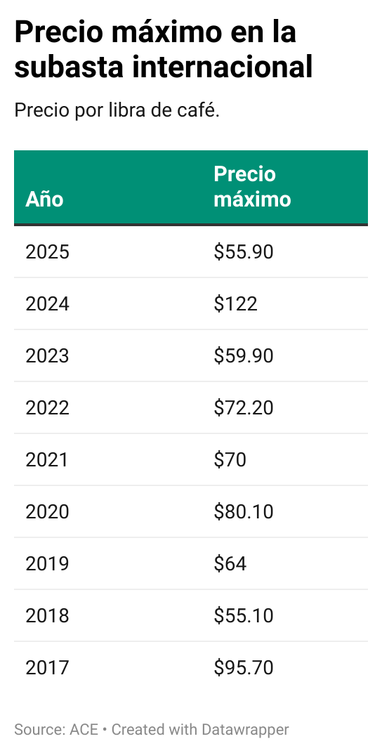 El precio de esta subasta es el más bajo en ocho años, desde los $55.10 registrados en el certamen de 2018. Además, El Salvador tuvo el valor más bajo frente a sus vecinos en Centroamérica: Nicaragua vendió a un máximo de $88.20, Honduras a $88.48, Costa Rica a $91 y Guatemala rompió récord con $143.10.