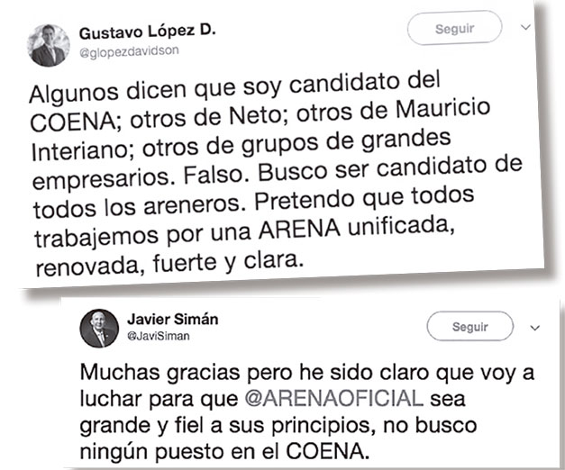 Una lucha por el control del Consejo Ejecutivo Nacional de Arena (Coena) se está dando en Alianza Republicana Nacionalista (Arena), de acuerdo a fuentes del partido de derecha y a expresiones en redes sociales que líderes del instituto político.