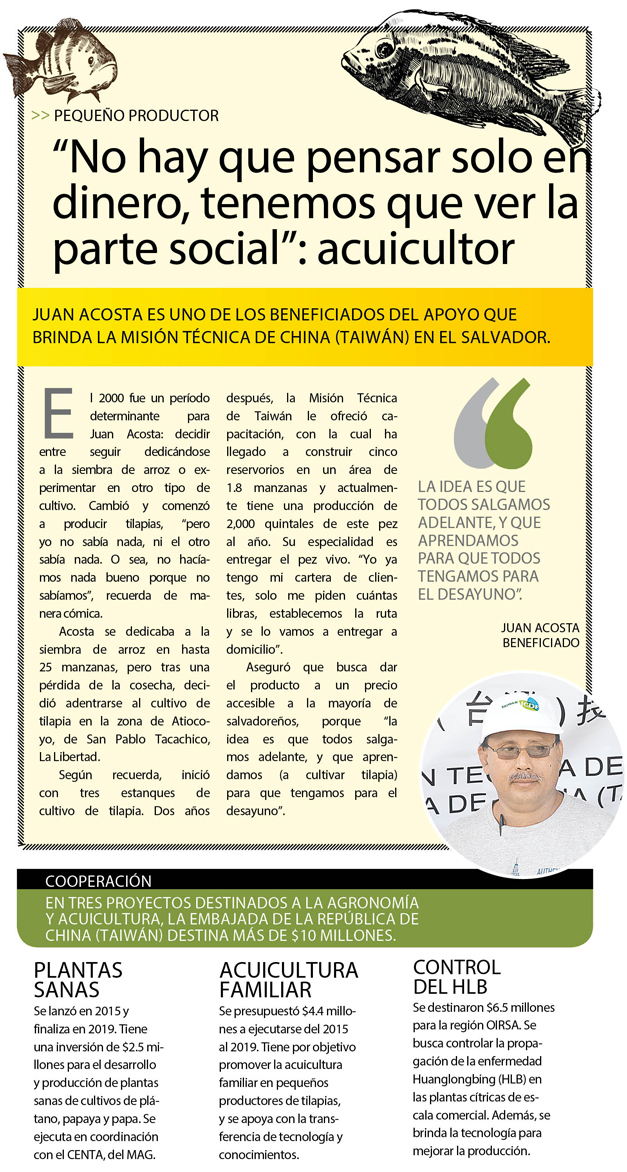 A menos de dos horas de distancia desde la urbe de San Salvador hacia el poblado Atiocoyo, de San Pablo Tacachico, en La Libertad, pero a más de un día de vuelo de la República de China (Taiwán), la misión técnica del país cooperante ha apoyado tanto en capacitación y financiamiento a granjas privadas de tilapia como a estaciones acuícolas a cargo de la Dirección General de la Pesca y la Acuicultura (Cendepesca).