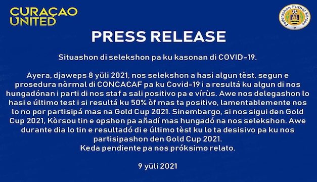 La La Federación de Fútbol de Curazao informó en un comunicado que tras las pruebas PCR realizadas el jueves 8 de julio como parte del protocolo de la Concacaf para la Copa de Oro 2021, varios de sus jugadores y parte del staff resultaron positivos de covid-19.