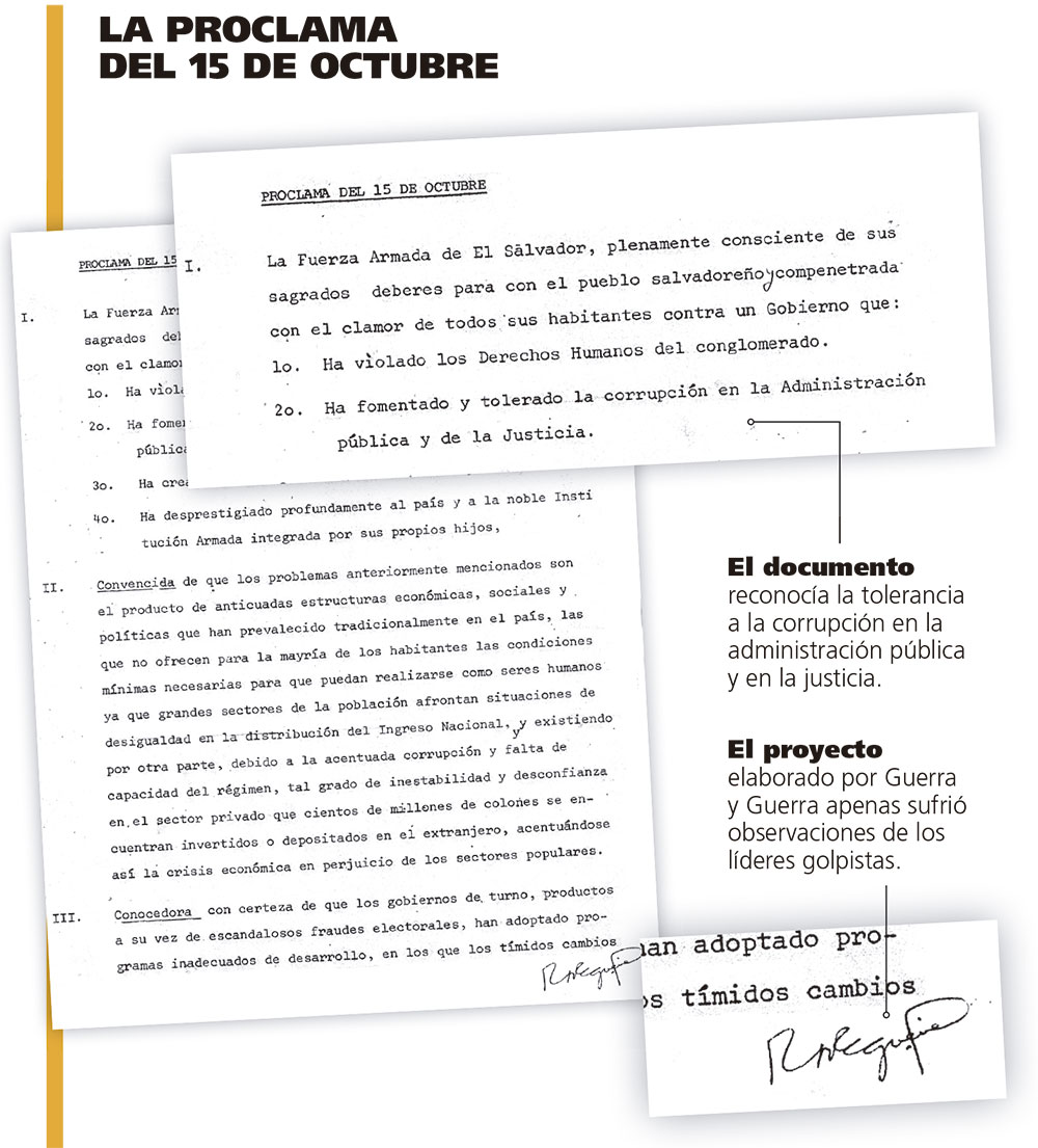Mi primera misión consistía en ir a las seis de la mañana a casa de Román Mayorga para mostrarle el único borrador que existe de la Proclama, junto con otras dos propuestas: una preparada por Mariano Castro Morán y Ulises Flores, y otra por Francisco Roberto Lima. Román analizó los tres documentos y escogió el que yo había preparado, pidiendo solamente que no se incluyera la disolución del PCN”. Rodrigo Guerra en su libro “Un golpe al amanecer” (Índole Editores, 2009).Posteriormente, otros abogados militares sugirieron la eliminación de las referencias sobre la “distribución equitativa de la riqueza” y la mención de que la Fuerza Armada “ha violado los derechos humanos del conglomerado”. Ambas citas, sin embargo, se mantuvieron en el texto que fue leído a medianoche en cadena nacional de radio y televisión.
