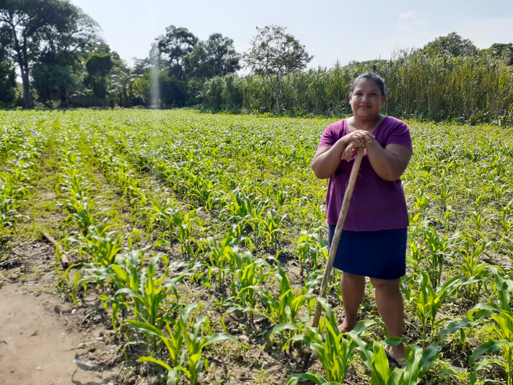 Camelia Vides con sus cultivos de maíz en los que trabaja cada año.