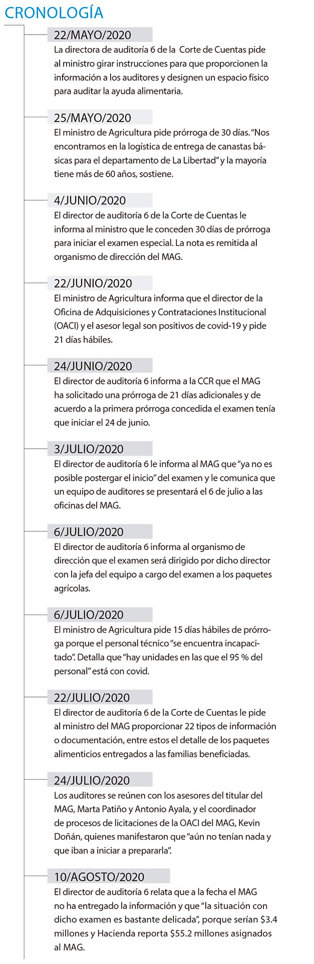 La Corte de Cuentas intentó iniciar la auditoría al MAG desde el 22 de mayo. El ministro de Agricultura pidió prórrogas el 26 de mayo, el 22 de junio y el 6 de julio. En la primera petición, alegó que estaban distribuyendo paquetes de ayuda y carecían de suficiente personal. En las siguientes, alegó contagios del encargado de licitaciones y luego que el personal técnico estaba contagiado.