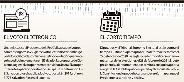 La situación se complica por la discordia entre la Asamblea Legislativa y la Presidencia de la República: mientras los diputados aprobaron una reforma que permite la votación por correspondencia y únicamente para diputados, el presidente, Nayib Bukele, pide voto electrónico, una representación de diputados para los salvadoreños en el exterior y que participen en la elección de concejos municipales.
