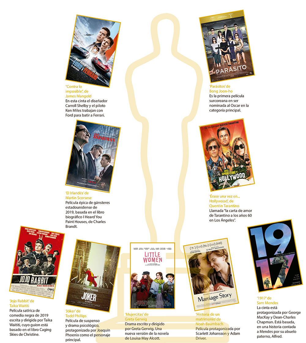 En la categoría más importante darán también la pelea “1917”, “Contra lo imposible”, “El irlandés”, “Jojo Rabbit”, “Mujercitas”, “Historia de un matrimonio” y “Había una vez en Hollywood”.