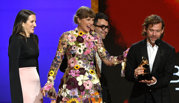Laura Sisk, Taylor Swift, Jack Antonoff y Aaron Dessner aceptan el premio Álbum del año por 'Folklore' en el escenario durante la 63a Entrega Anual de los Premios GRAMMY en el Centro de Convenciones de Los Ángeles el 14 de marzo de 2021. AFP