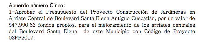 ¿Pero cuánto aprobó el concejo para esta obra? Tuvieron un costo de $47,990.63 según el acuerdo número 5 de la sesión ordinaria del concejo municipal de Antiguo Cuscatlán, aprobado el 3 de mayo de 2017. El documento completo es público y puede consultarlo aquí.