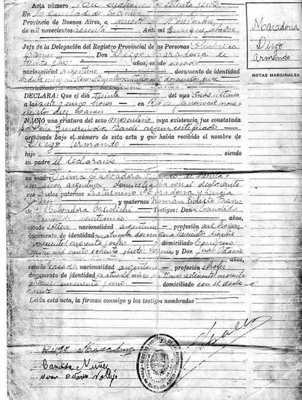 Diego Armando nació a las 7:05 a.m. del domingo 30 de octubre de 1960 en el Policlínico de Lanús, ubicado entonces en la calle Río de Janeiro al 1910. Hijo de Dalma Salvadora Franco, Doña Tota, y “el declarante”, como citaron a Don Diego Maradona en el acta de nacimiento del cuarto de los ocho hijos de la familia.