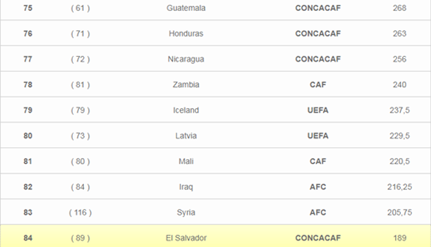 Del área de CONCACAF, la liga MX es la mejor ubicada en el ranking; se encuentra en la casilla 20, le sigue la MLS desde lejos, en la casilla 53. Luego sigue la liga de Costa Rica, en la casilla 54; la guatemalteca, en el puesto 75; la hondureña, en el 76 y la nicaragüense, en el 77, siete casillas por encima de la salvadoreña.