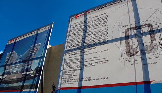Pero no todo el texto en los anuncios está en chino, alguna información está en español y se trata del nombre de la obra, el lugar de construcción, la superficie (23,759.5 metros cuadrados), el número de pisos que tendrá, la altura y la función principal.En el arco está escrito “Grupo Técnico del Proyecto de Asistencia de la Biblioteca Nacional de El Salvador” y al costado derecho el nombre “YANJIAN”, que es la empresa constructora encargada del proyecto y algunos de sus principios y logros.