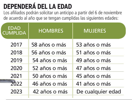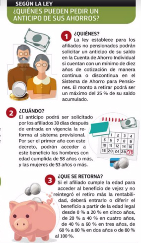 El afiliado con 10 años de cotización en el Sistema de Ahorro para Pensiones podrá solicitar hasta el 25 % del total de su saldo en la Cuenta Individual de Ahorro para Pensiones. Tiene que reintegrar su anticipo
