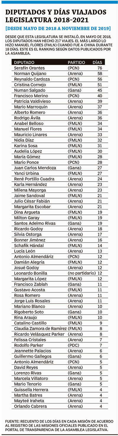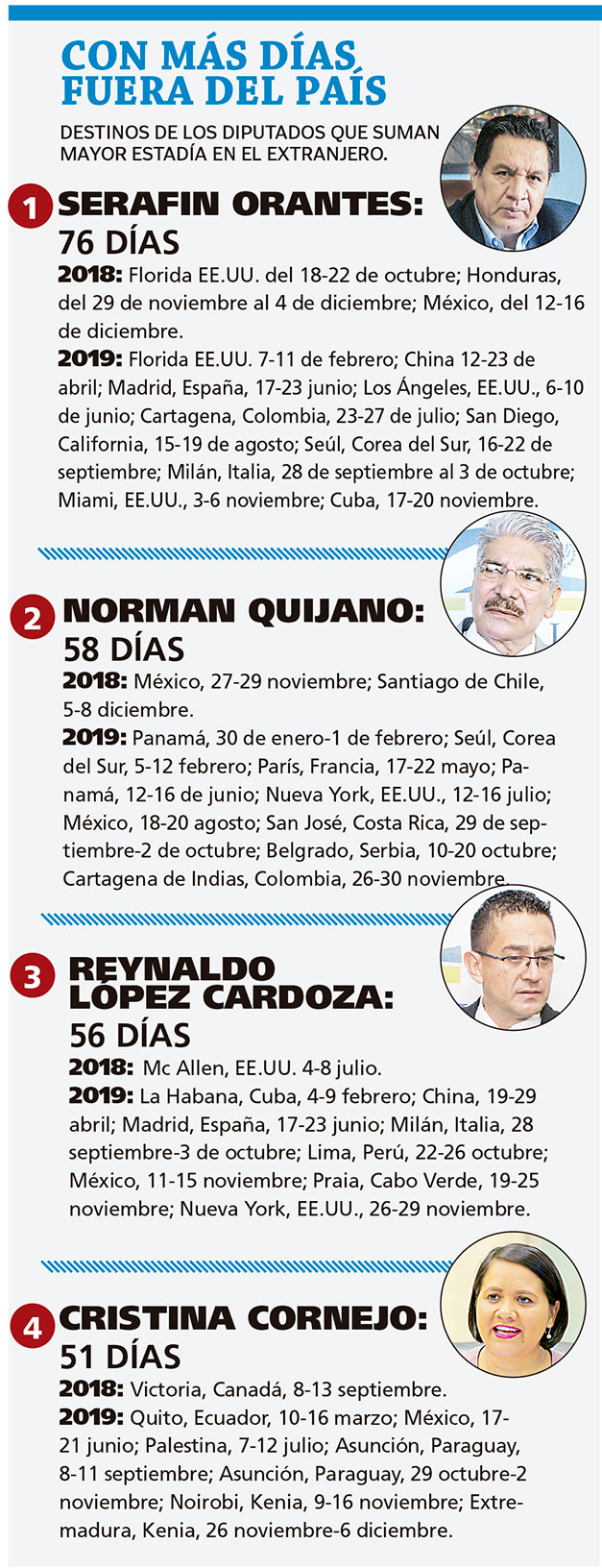 El pecenista Serafín Orantes es el diputado que más días ha acumulado fuera del país: 76 días. Inició con un viaje del 18 al 22 de octubre de 2018 a Tampa, Florida, Estados Unidos, y su viaje más largo, de 12 días, lo hizo en abril a China.