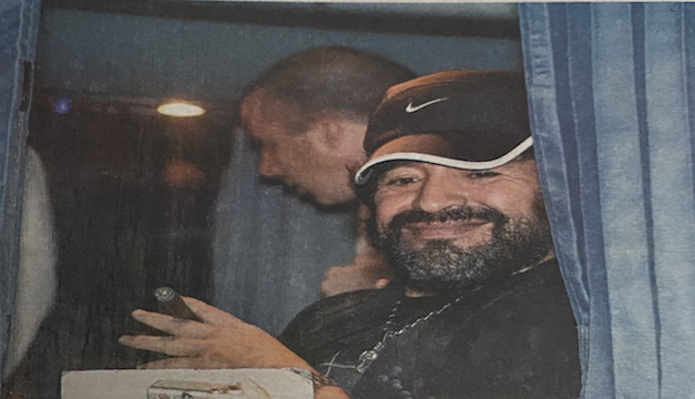 Maradona se fue para uno de los asientos de la terminal y se sentó sobre una de las butacas. Vestía una gorra Nike, unos zapatos Ferrari, con camiseta y calzoneta. Todo de color negro.