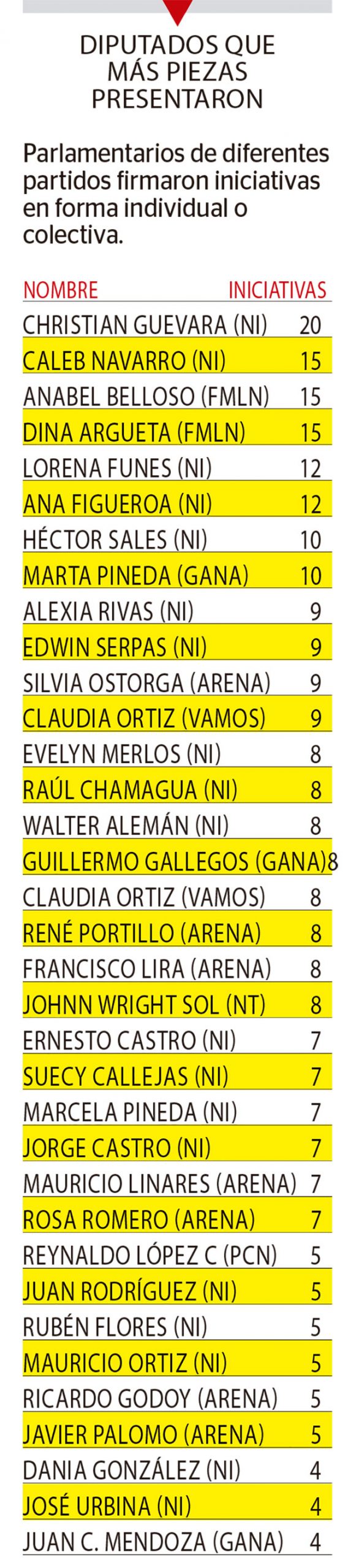 El coordinador y el subcoordinador del grupo parlamentario de Nuevas Ideas, Christian Guevara y Caleb Navarro, respectivamente, son quienes más iniciativas ha presentado, tanto de manera individual como colectiva, es decir, acompañando con sus firmas propuestas de otros diputados.