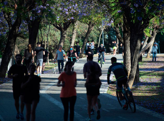 Gente hace ejercicio en Sevilla el 2 de mayo de 2020, durante las horas permitidas por el gobierno para salir y hacer ejercicio, por primera vez desde el comienzo de un bloqueo nacional para prevenir la propagación de la enfermedad COVID-19. AFP