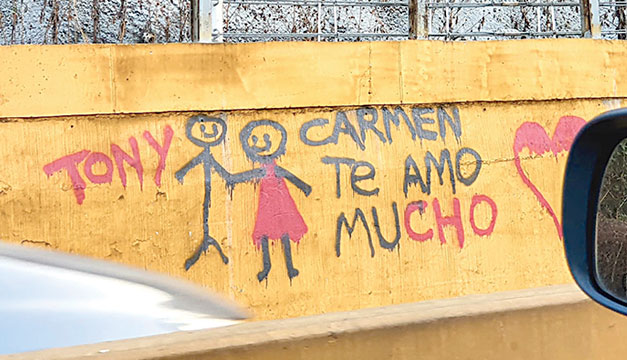 Ahí, escondidos entre el graffiti de pandillas, publicidad, arte urbano están los mensajes de amor. Algunos más legibles que otros. Unos más creativos y otros muy dulces. En inglés o en español, con dibujos y hasta con nombres y apellidos. Así son.