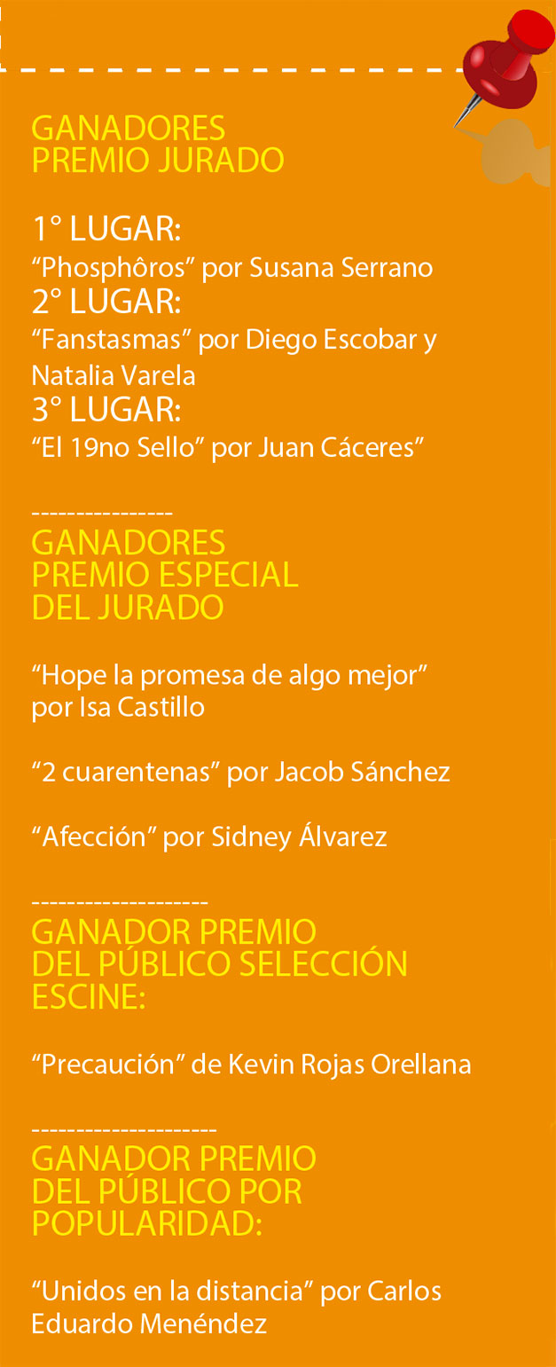 Finalmente, el domingo por la noche se anunciaron a los máximos galardonados esta iniciativa donde “Phosphôros” de Susana Serrano se agenció el primer lugar, “Fantasmas” de Diego Escobar y Natalia Varela obtuvieron el segundo lugar y “El 19no Sello” de Juan Cáceres fue acreedor del tercer lugar.