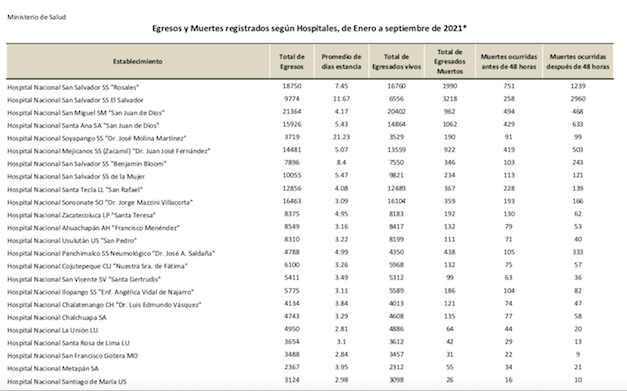 El informe también señala que 11,647 personas han fallecido entre enero y septiembre en los 31 hospitales nacionales, sin especificar la causa del deceso. Pero el hospital El Salvador es el que ha reportado la cantidad más alta de fallecidos con un 27.6 % de las muertes solo en ese lugar.