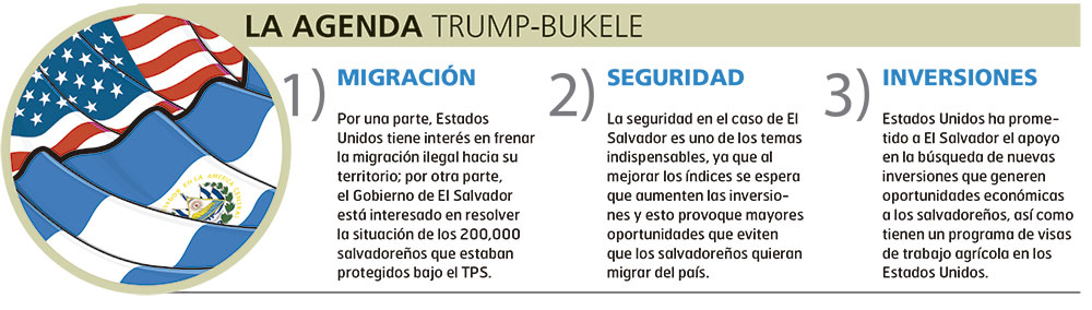 “Vamos a hablar de varios temas que están en la agenda de ambos: la seguridad, sobre todo en el caso nuestro. Hay un tema en el que presiona mucho Estados Unidos, que es el de migración y que tiene que ver directamente con la seguridad; el tema del crecimiento económico de El Salvador porque, si seguimos creciendo al 2 %, no vamos a dar oportunidades a nuestra gente y no podremos bajar el nivel de migrantes, aunque se ha reducido considerablemente”, dijo Bukele a periodistas tras salir de una entrevista en el diario The Wall Street Journal.