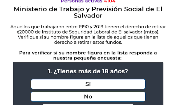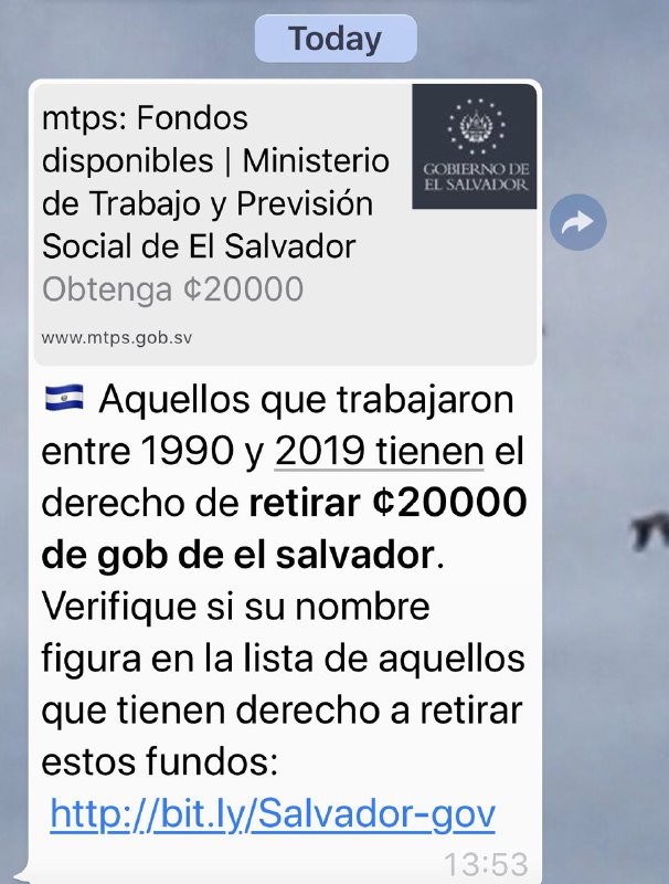 En aplicaciones de mensajería como WhatsApp ha estado circulando un mensaje que dice así: "Aquellos que trabajaron entre 1990 y 2019 tienen el derecho de *retirar ¢20000 de gob de el salvador*. Verifique si su nombre figura en la lista de aquellos que tienen derecho a retirar estos fondos".