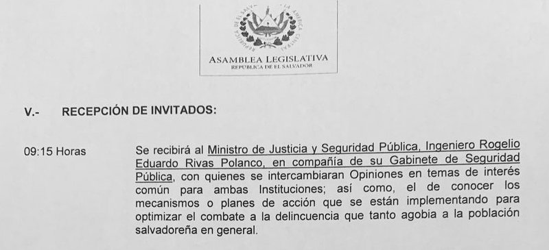 “Al respeto informo por designación presidencial, se me hace imposible comparecer, ya que por instrucciones directas e instrucción del cumplimiento del plan de seguridad de este gobierno, es requerida mi presencia en el caudal Río Grande de San Miguel, debido a que esta cartera de Estado, la Dirección General de Centros Penales y cuatro ministerios más lideran el proyecto de recuperación y restauración de la zona”, leyó esta mañana el diputado Antonio Almendáriz, presidente de la Comisión de Seguridad, ante el resto de legisladores de la comisión parlamentaria.